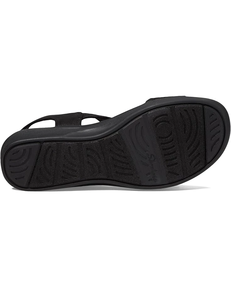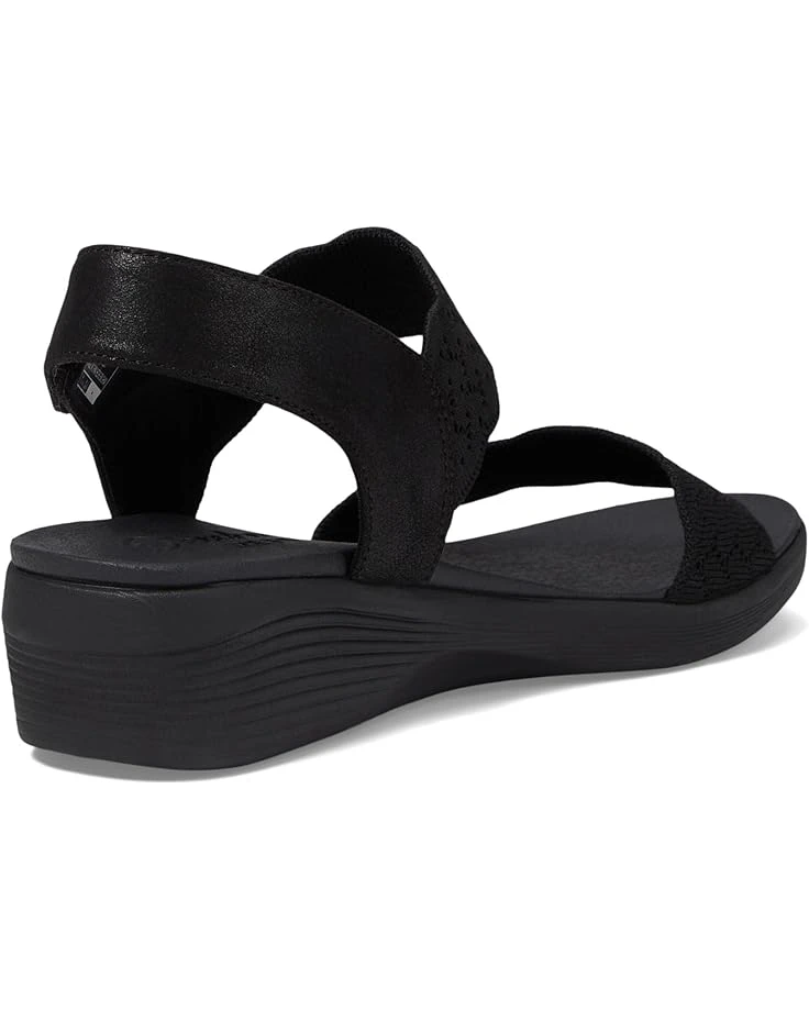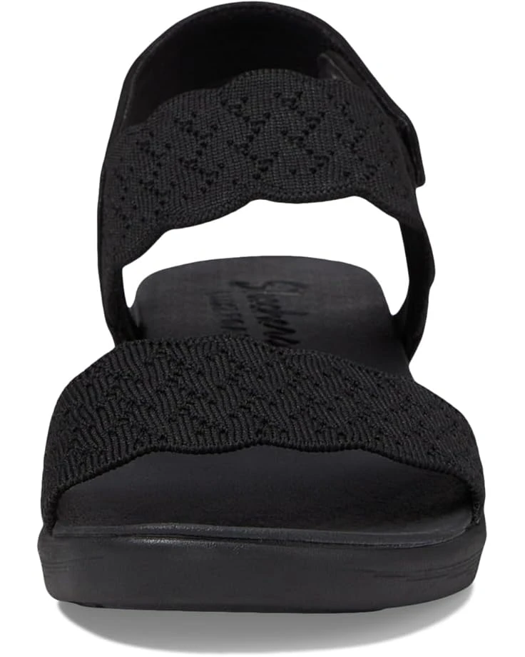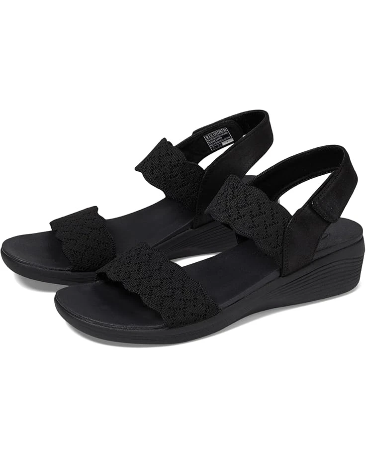 - Walk light and free wearing the SKECHERS® Arya – On The Rise. Crafted from scalloped knit upper, this pair of sandals features round toe design, luxe foam cushioned footbed, pull-on style, and ankle strap detailing.