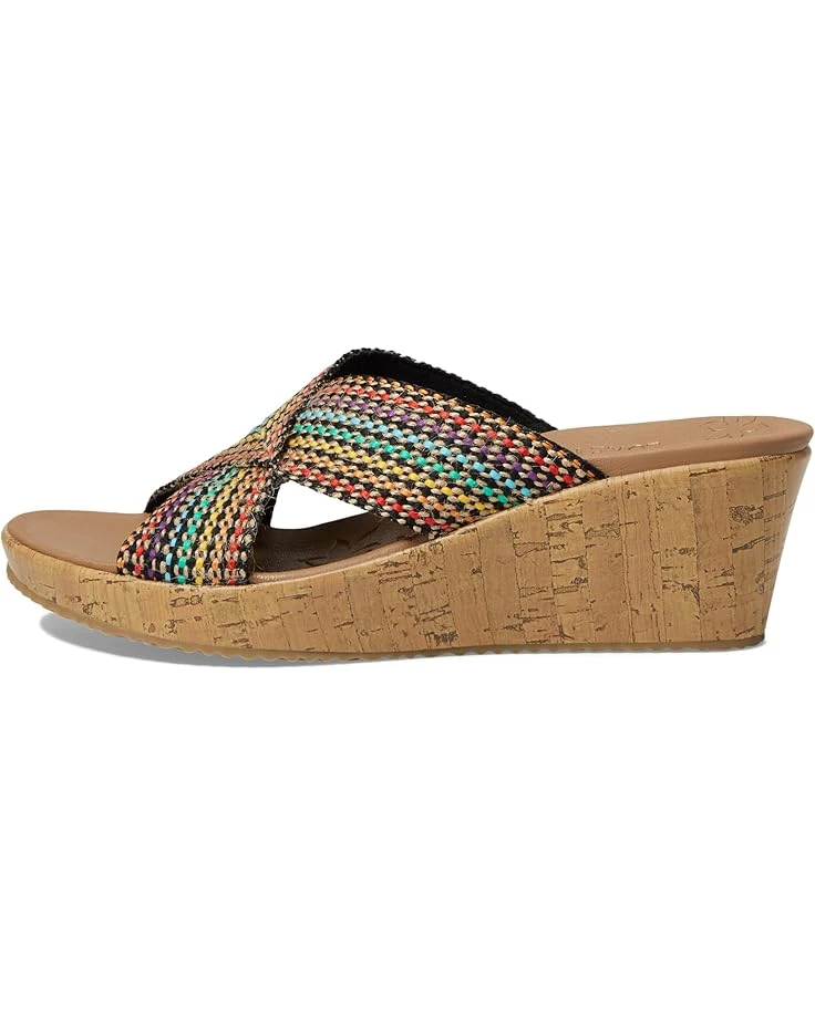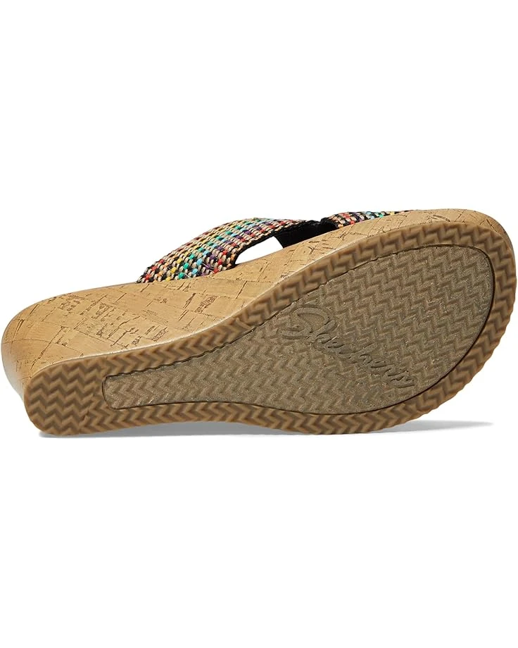 - The SKECHERS® Beverlee – Delighted sandal will add style and comfort to any ensemble with a woven natural fiber upper, an open toe, and crisscrossing vamp straps with a woven finish.
