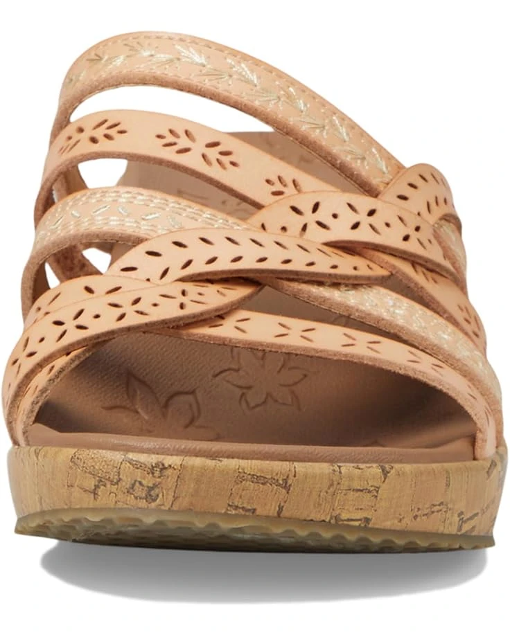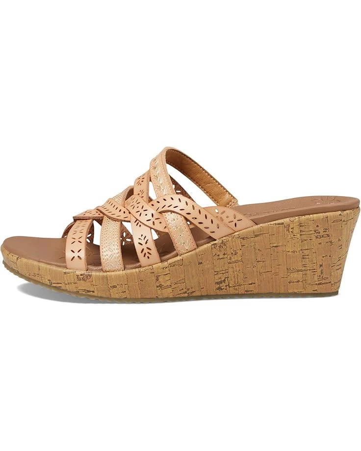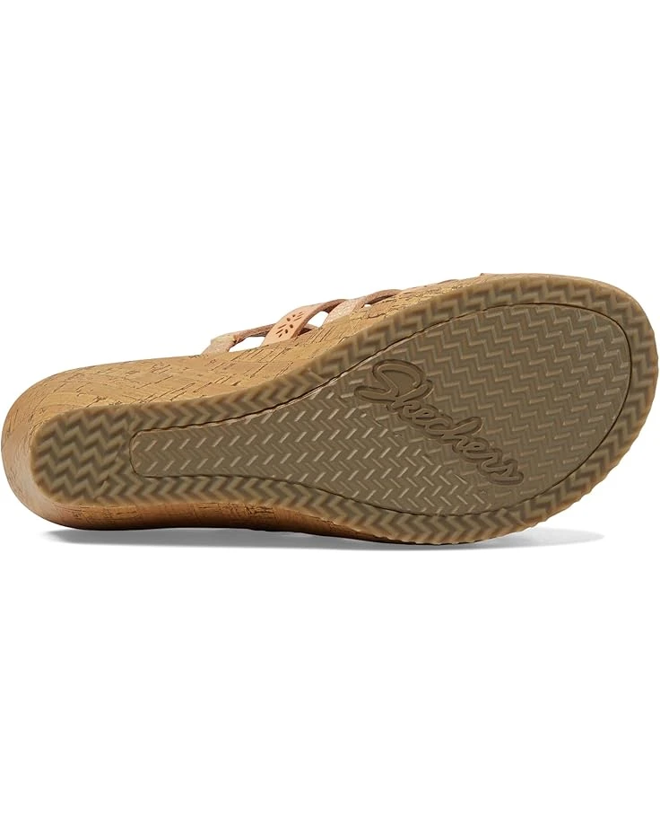- Take your casual style to new heights by complementing outfits with the slip-on style SKECHERSยฎ Beverlee – New Resort Heels in a sleek design with solid wedge heel. The heels are crafted with vegan materials including a duraleather upper, luxe foamยฎ cushioned comfort footbed, and EVA midsole with a faux cork wrap. The strappy detailing with intricate cut-outs elevate the overall look.