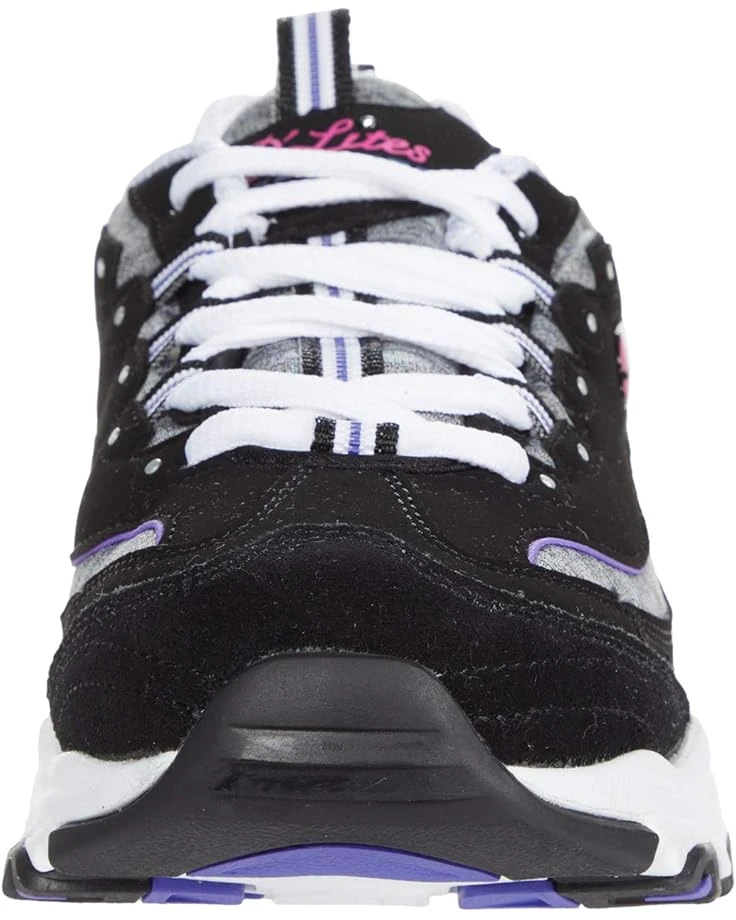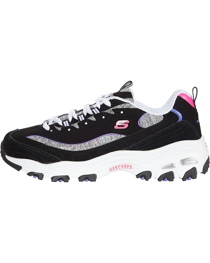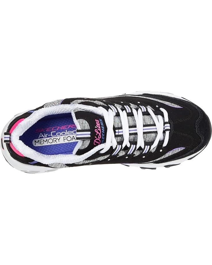 - The SKECHERSยฎ D’Lites – Sparkling Rain sneaker offers a feminine design and lasting comfort with an athletic-inspired silhouette, colorful synthetic panels, and comfortable padding at the tongue and collar.