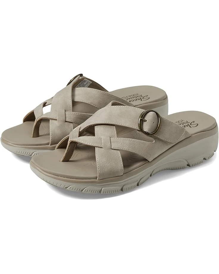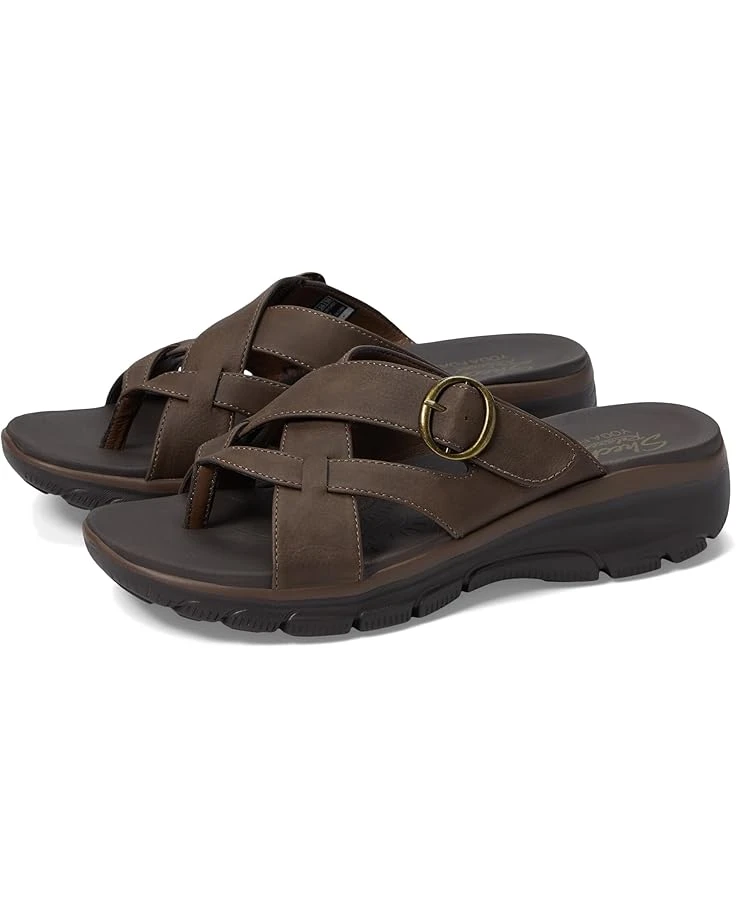 - Designed with an EVA midsole that offers long-lasting comfort and absorbs shock, the SKECHERS® Easy Going – Sundown sandals are easy to slip on and off. The strappy design with a buckle detail offers a secure fit and durable support. Perfect for your beach trips and vacations, these slide sandals keep your feet cool and comfortable all day.