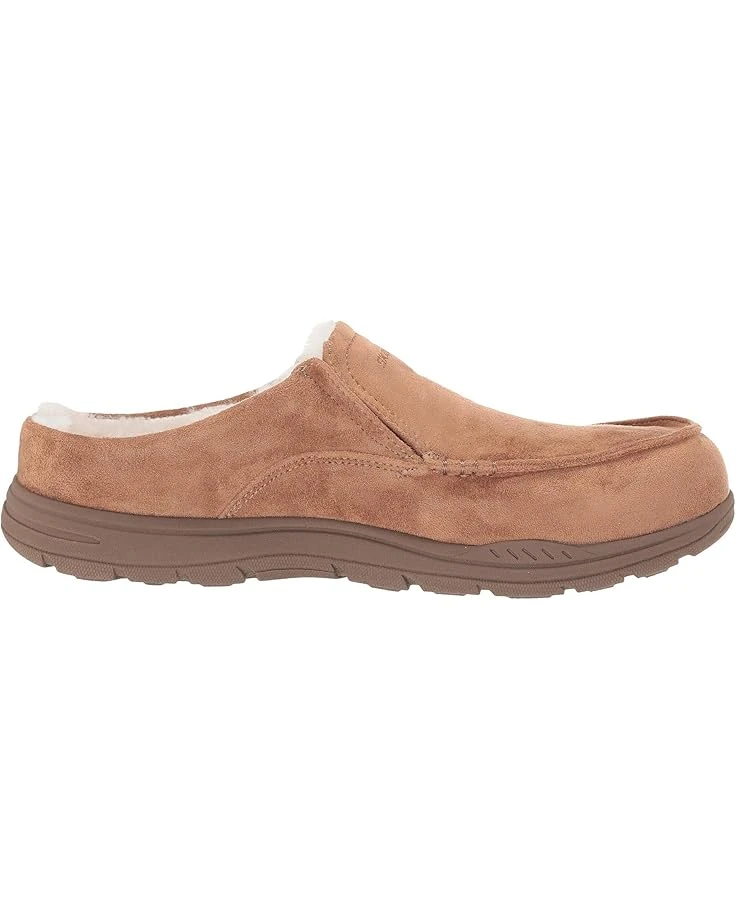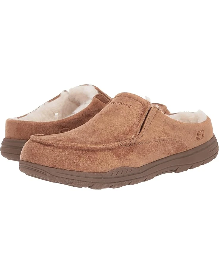 - The SKECHERS® Expected X Verson slipper offers optimal comfort with a suede-like finish, slip-on construction, and a faux-fur collar trim.