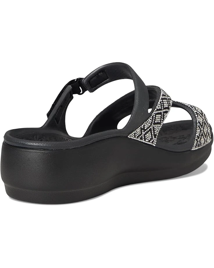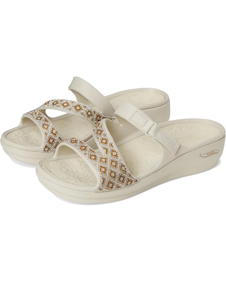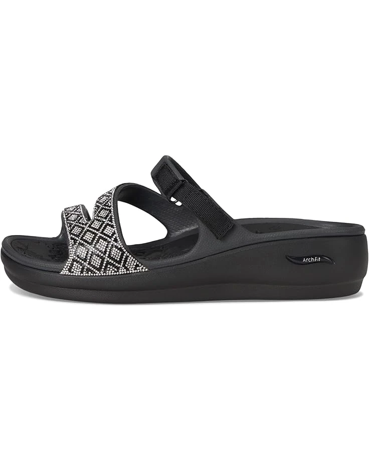 - Walk with breezy supportive comfort wearing the SKECHERS® Foamies Arch Fit Ascend – Show Stopper sandals. These sculpted foamies slide sandals feature an adjustable cross strap, bead embellished EVA upper, luxe foam cushioning, plus a durable dual-density traction EVA outsole for stability. The patented Skechers Arch Fit contoured footbed with podiatrist-certified arch support helps mold to your foot to reduce shock and increase weight dispersion.