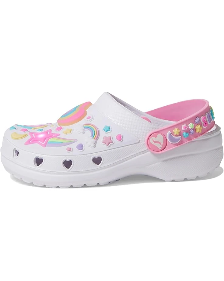 - Let your little one step into fun and happy moments wearing the SKECHERS® KIDS Heart Charmer – Miss Girly. Crafted from lightweight flexible perforated foam EVA upper, lining and insole, this pair of sandals features round toe, slip-on closure with convertible heel strap, contoured cushioned footbed and lighted unicorn vamp.