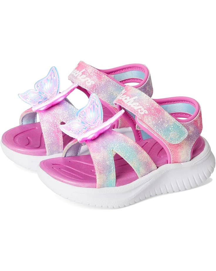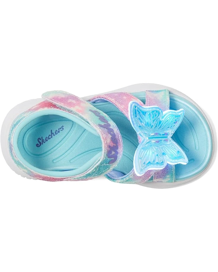 - Brighten up your little one’s day with the cute SKECHERSยฎ KIDS Jumpsters Sandal – Butterfly Brites 303109N. The cotton-lined sandals feature an ombre synthetic upper with metallic print detail, an adjustable hook-and-loop strap for fit, comfortable midsole, and a cushioned comfort EVA insole. The exquisite butterfly motif and light up design make this a must-have for your little one.