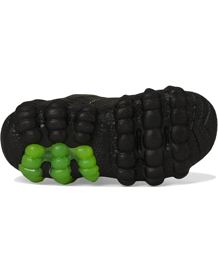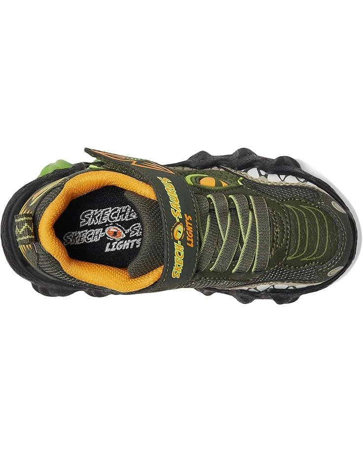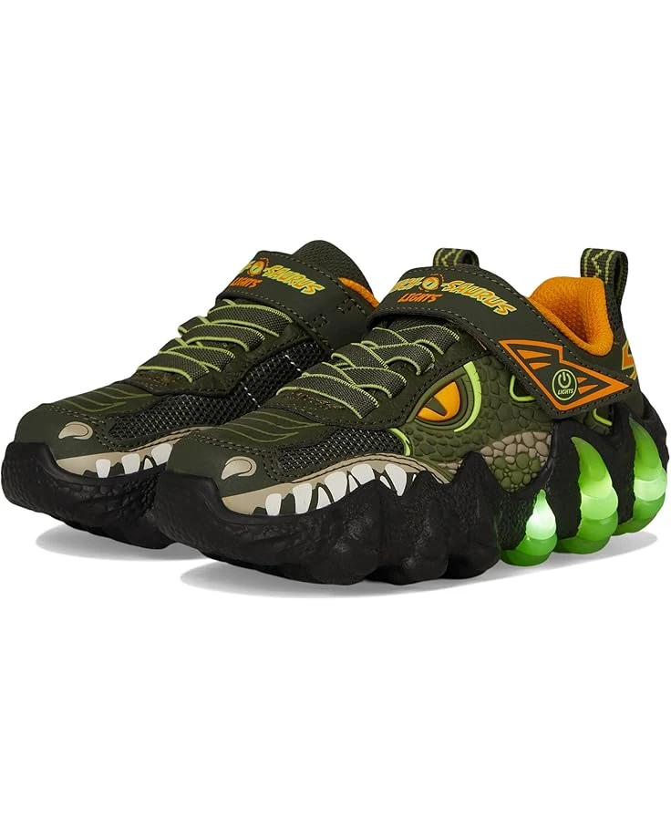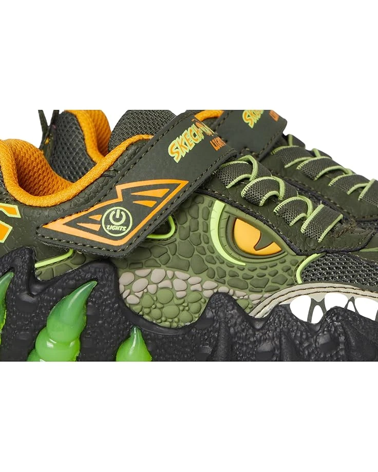 - Dino-mite kicks for dino-mite kids! The SKECHERSยฎ KIDS Skech-O-Saurus Lights 2.0 will have your little ones stomping with joy. Designed for little adventurers, these sneakers combine dinosaur style and unbeatable comfort. The vibrant reptilian-themed upper, crafted from faux leather and breathable mesh, brings their wildest imaginations to life. Featuring an easy-on, easy-off adaptive closure, kids can enjoy a customized fit that keeps up with their playful spirit. The light-up feature, activated by a simple button, adds an extra sparkle to every stomp, while the shock-absorbing T-Rex midsole provides the support needed for all-day adventures. With cotton lining and a cushy EVA insole, these shoes keep little feet comfy and ready for anything.
