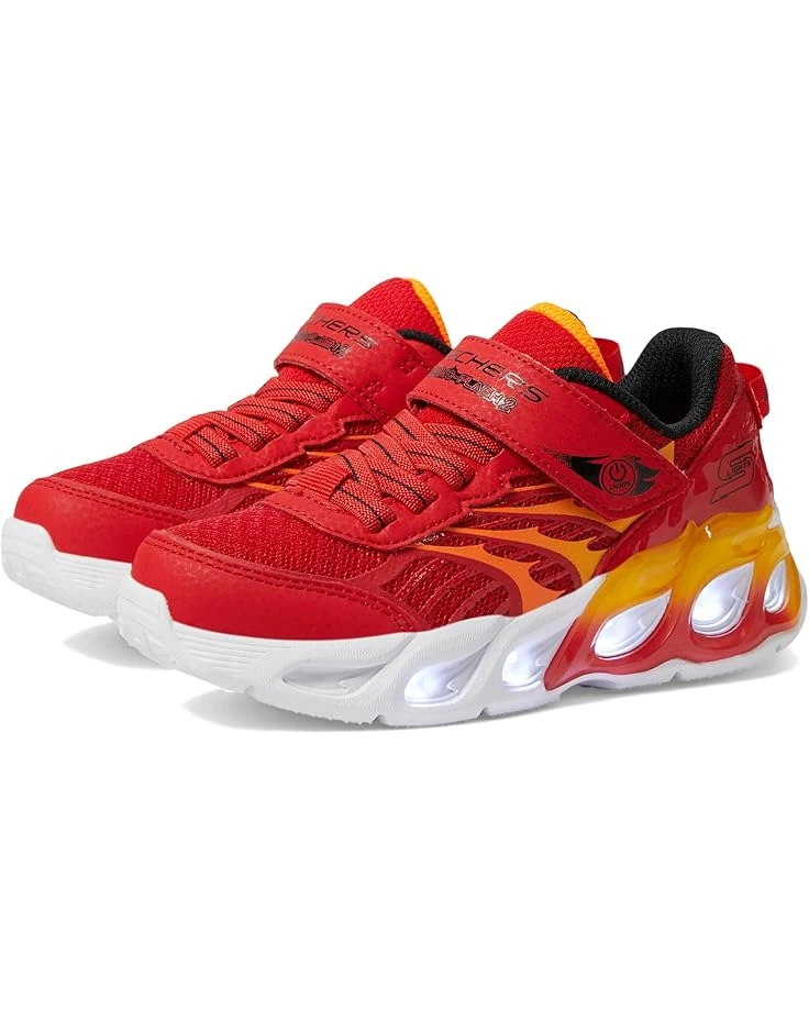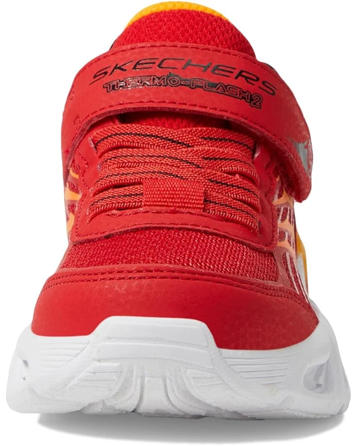 - Energize each stride styling SKECHERSยฎ KIDS Thermo-Flash 2.0! Watch your child’s steps come alive with vibrant, light-up excitement. The shock-absorbing midsole, adorned with flame-themed tech, ensures comfort and style. The on/off light button adds convenience, while the fire-themed mesh and synthetic upper offers breathability. With stretch laces and an adjustable strap, these shoes fit perfectly. Complete with a rubber insole and flexible traction synthetic rubber outsole, it’s the ultimate blend of comfort and coolness.