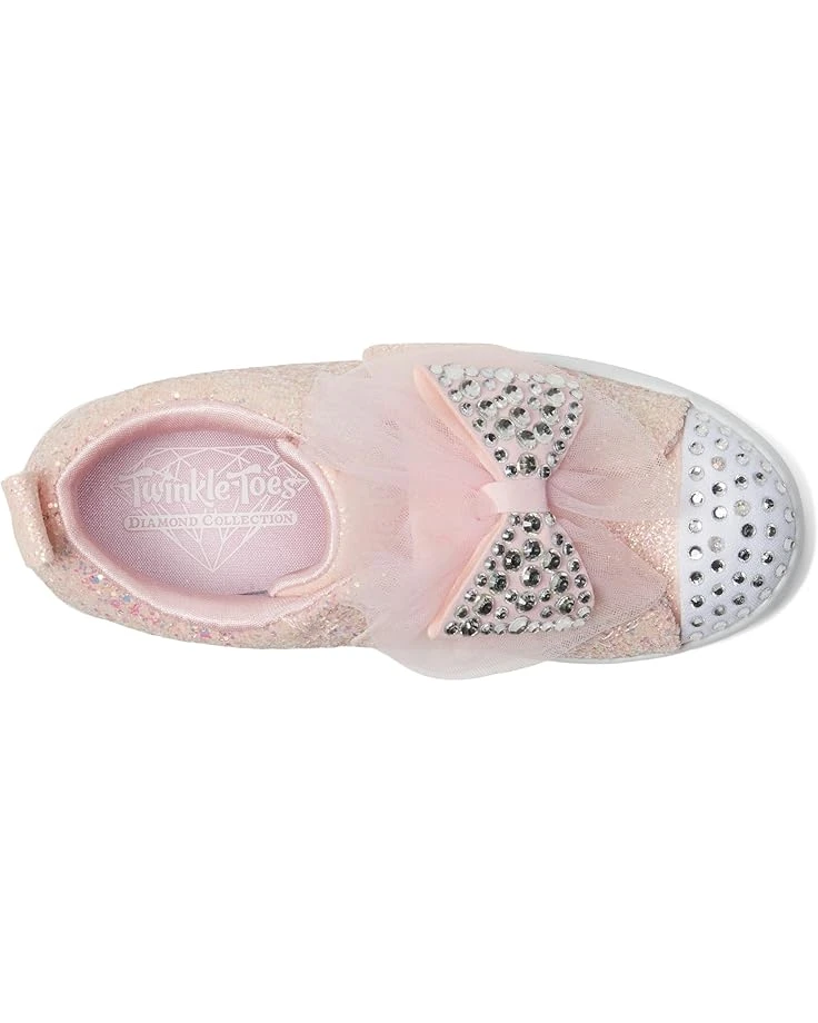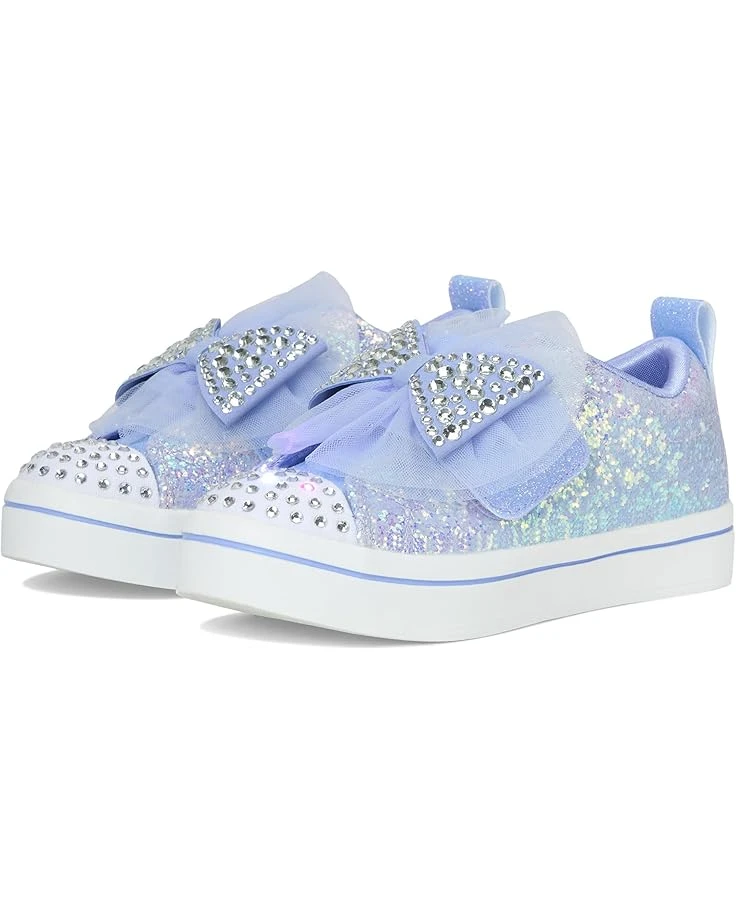 - Let your kid stand out with style wearing the SKECHERSยฎ KIDS Twi-Lites 2.0 314382L shoes. These lighted sneakers feature a rhinestone embellished toe cap, synthetic chunky glitter canvas upper, Skechers adaptive closure, and a tulle and rhinestone bow front detail. The cushioned comfort rubber insole and cotton lining keep your kid’s feet cool and comfortable. Designed with an on/off button, these slip-on shoes make a great addition to your kid’s footwear collection.