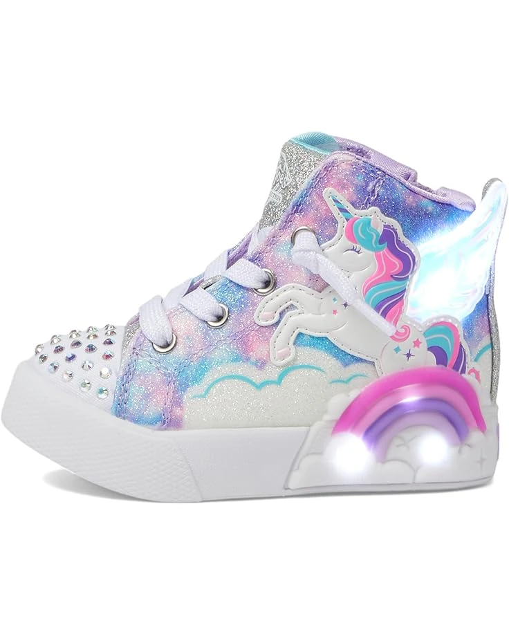 - Sparkle & shine with every step! Dazzle your world in magical fun wearing Skechers® Twinkle Toes®: Twinkle Magic. This lighted high-top sneaker features a glitter finish upper adorned with flying unicorns and clouds, a rhinestone-embellished toe cap, and a convenient side zipper. With a comfortable canvas upper, nylon lining, and EVA insole and outsole, these shoes offer both style and comfort for your little star.