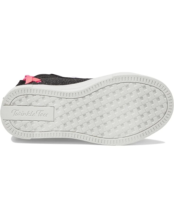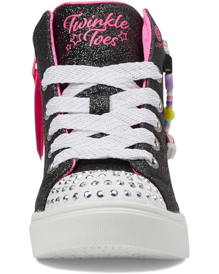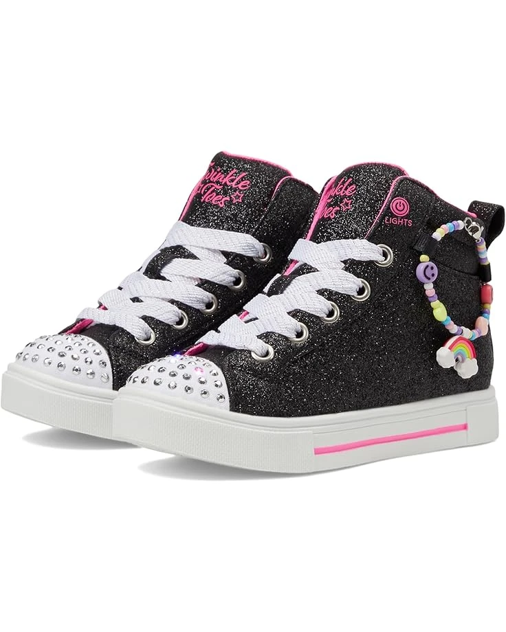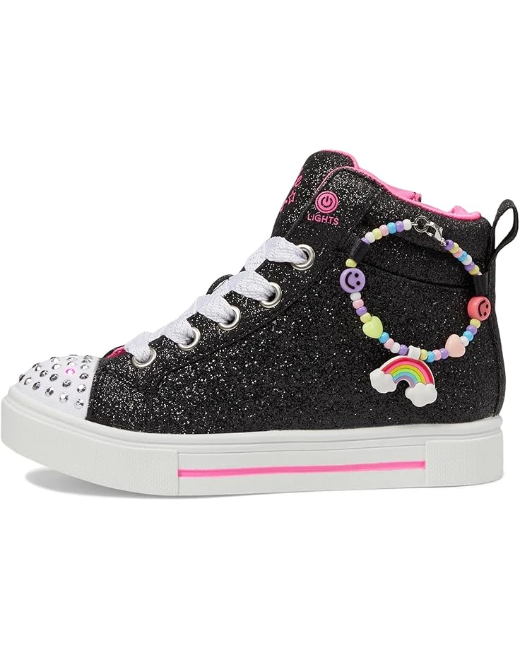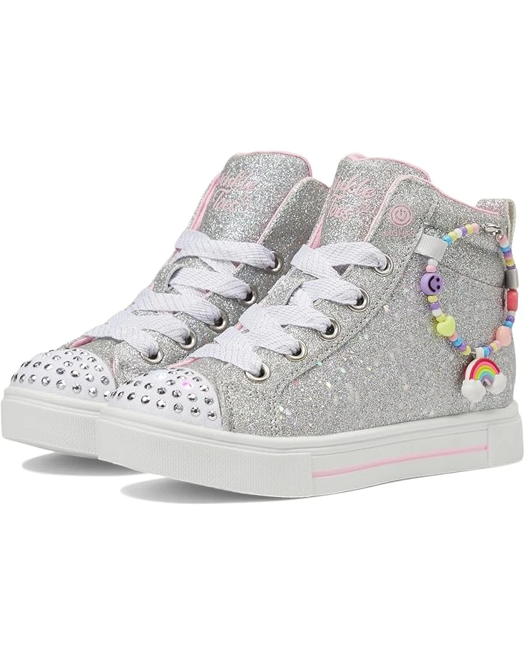 - Light up your little one’s world with SKECHERSยฎ KIDS Twinkle Sparks Charm Bestie! It features a glittery metallic fabric and synthetic canvas upper for a dazzling look. With a nylon lining, cushioned EVA insole, and outsole, these high tops offer ultimate comfort and support. The lace-up front, side zipper, and detachable charm bracelet add extra flair, while the light-up toe with on/off button brings fun to every step.