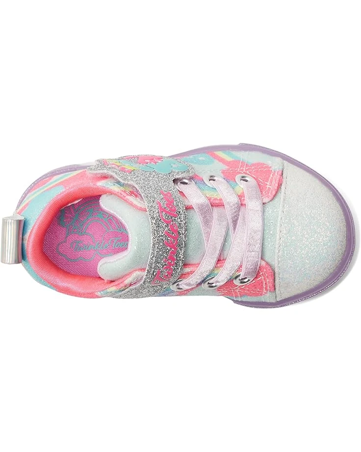- Make your little one happy wearing the SKECHERSยฎ KIDS Twinkle Sparks Ice 2.0 – Shimmering Sky 314749N with an attractive glittery upper with allover design and lighted details. The sneakers come with a synthetic upper, polyester lining, and removable cushioned comfort insole. The ankle pull tab is designed for easy donning and doffing.
