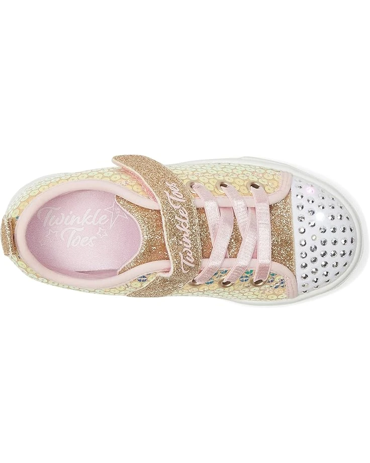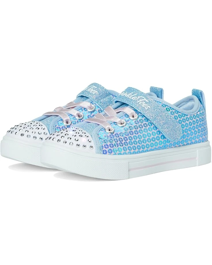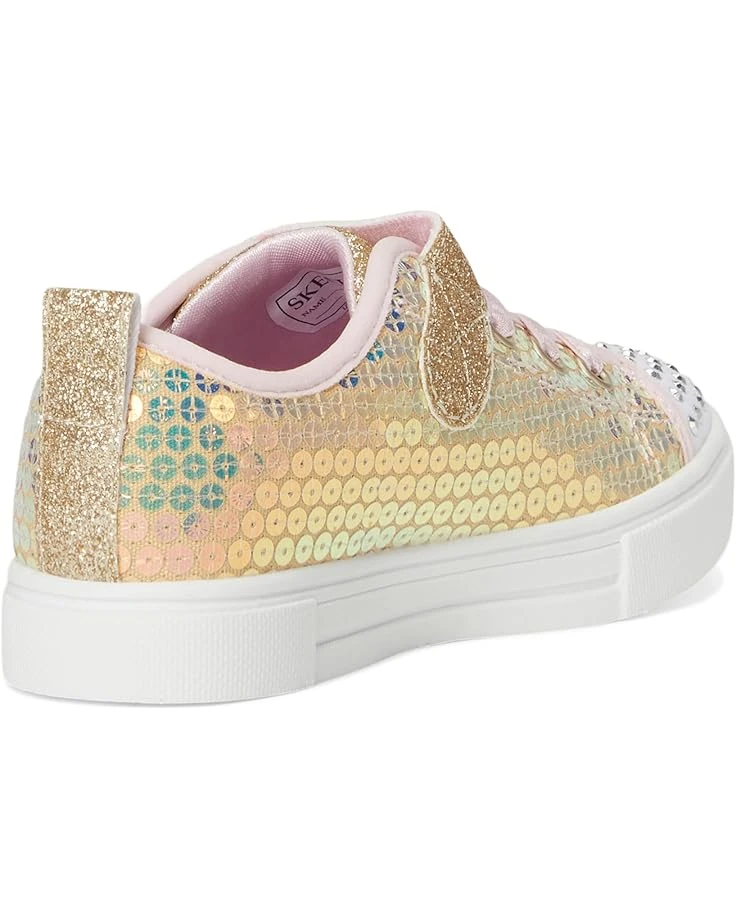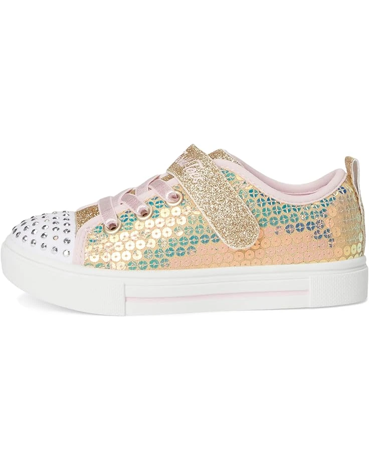 - Shine, sparkle, and step into magic sporting the SKECHERSยฎ KIDS Twinkle Sparks – Sequin Party! Perfect for your little trendsetter, these sneakers boast a sequin-embellished upper with glitter trim, featuring an eye-catching mermaid-inspired iridescent sequin gore. The light-up Twinkle Toes design adds an extra pop of fun with every step, while the cushioned EVA insole ensures all-day comfort. Stretch laces and an adjustable instep strap, powered by Skechers’ Adaptive Closure system, make for easy on and off, giving your child a perfect fit every time. With a nylon lining and Skechers logo detail, these sneakers bring dazzling style and endless comfort!