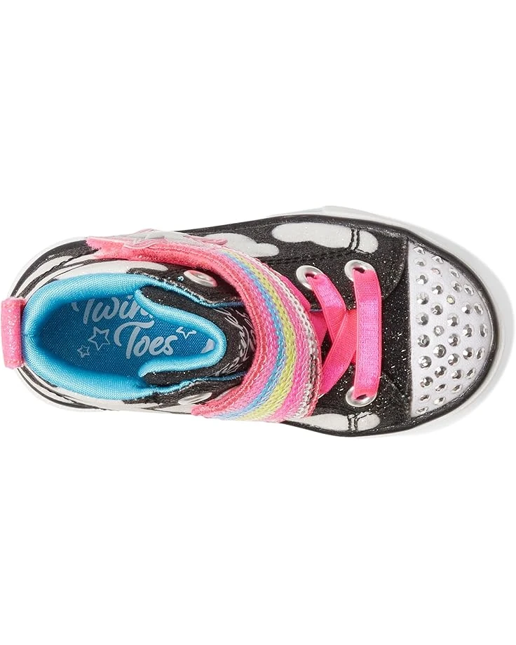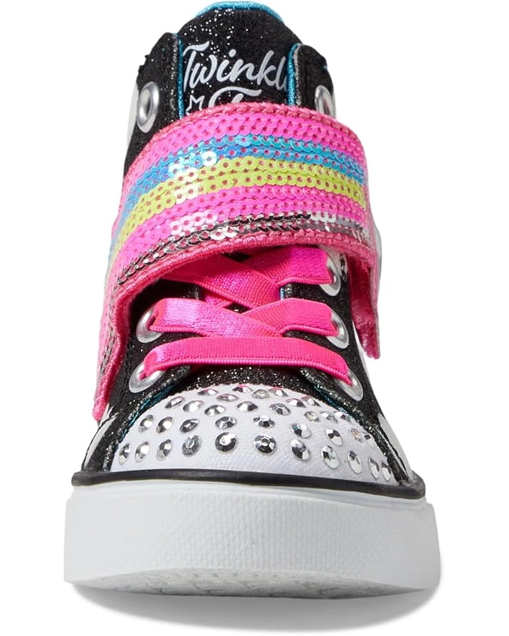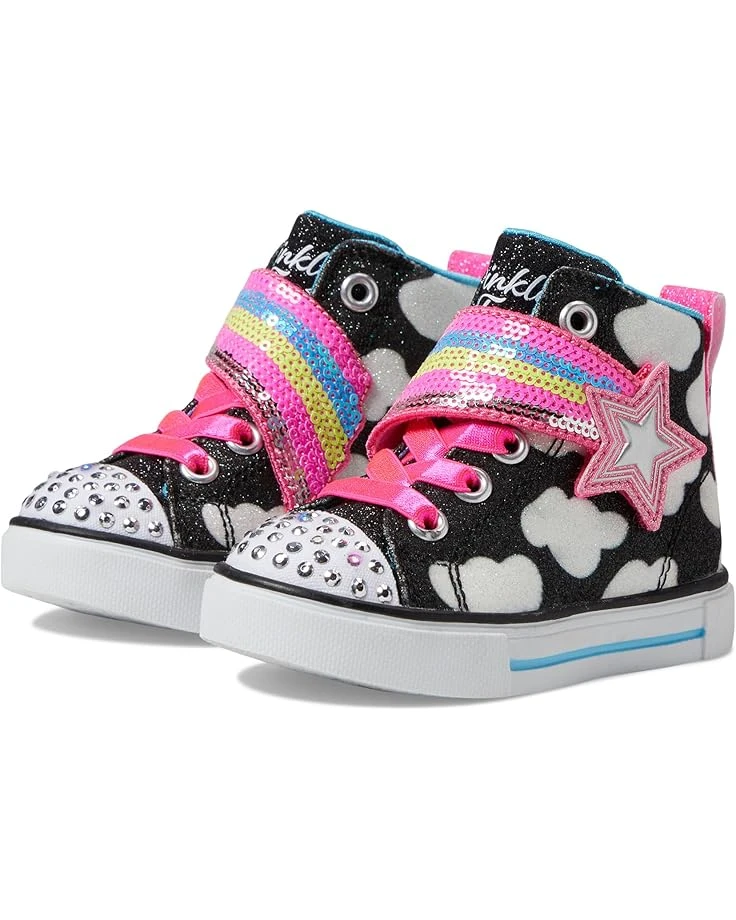 - Complement your kid’s playday look by choosing the SKECHERSยฎ KIDS Twinkle Sparks – Shooting Star Brights 314775N sneakers. Designed with a synthetic glitter cloud-printed upper with glitter trim, the casual sneakers have a high-top silhouette. They feature a breathable textile lining, cushioned comfort insole, and is decorated with Twinkle Toesยฎ light-up embellished toe.