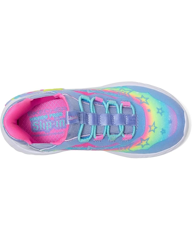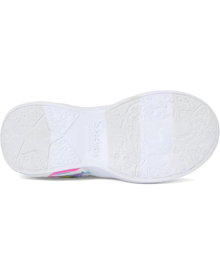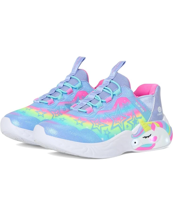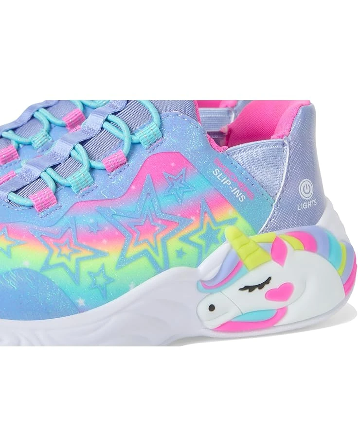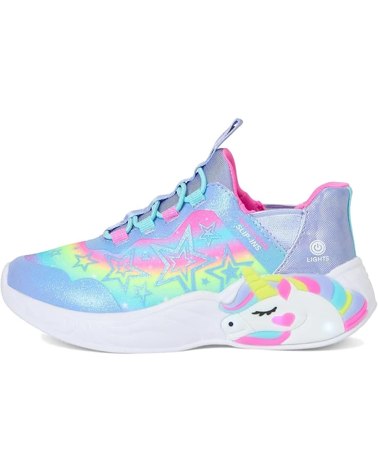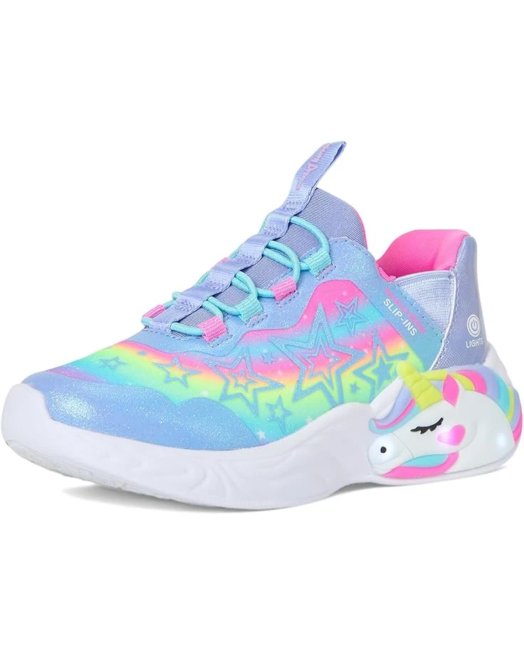 - Brighten up your little one’s day with the SKECHERS® KIDS Unicorn Dreams – Starry Lite 302296L . This Slip-ins® light-up design features our exclusive Heel Pillow™, a star print mesh upper with synthetic glitter overlays, bungee laces, and a sculpted light up midsole with unicorn embellished midsole, and a cushioned comfort insole. Featuring round toe, fixed stretch-laced front, and adaptive closure for a customized fit.