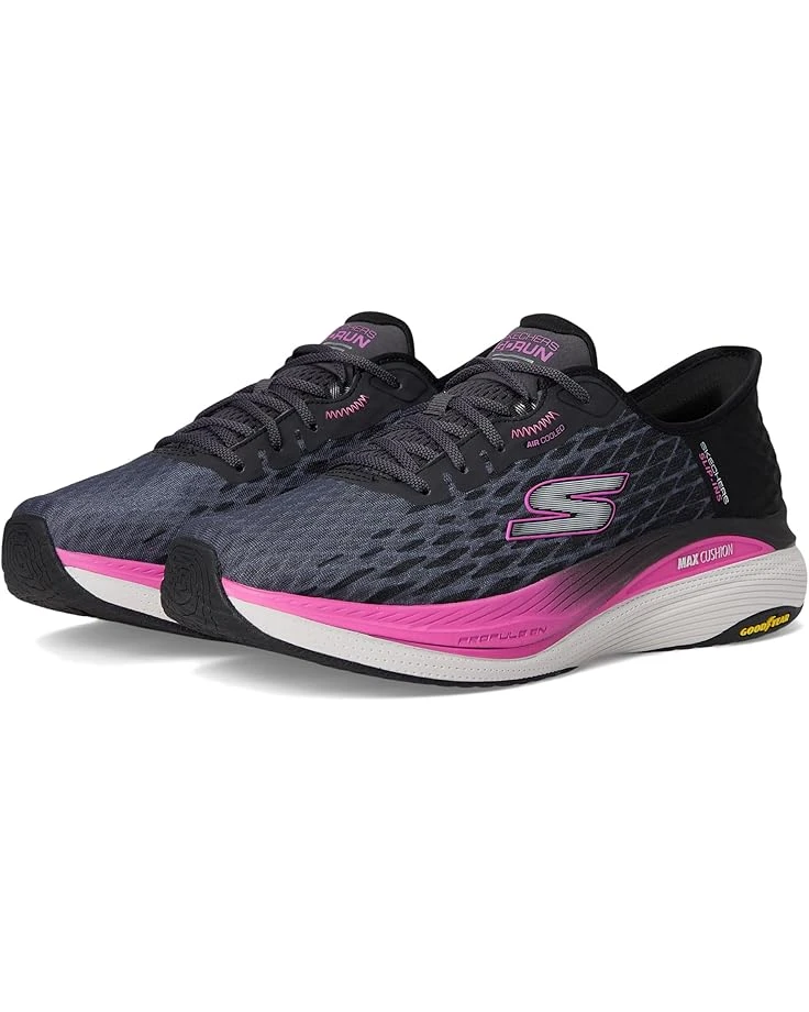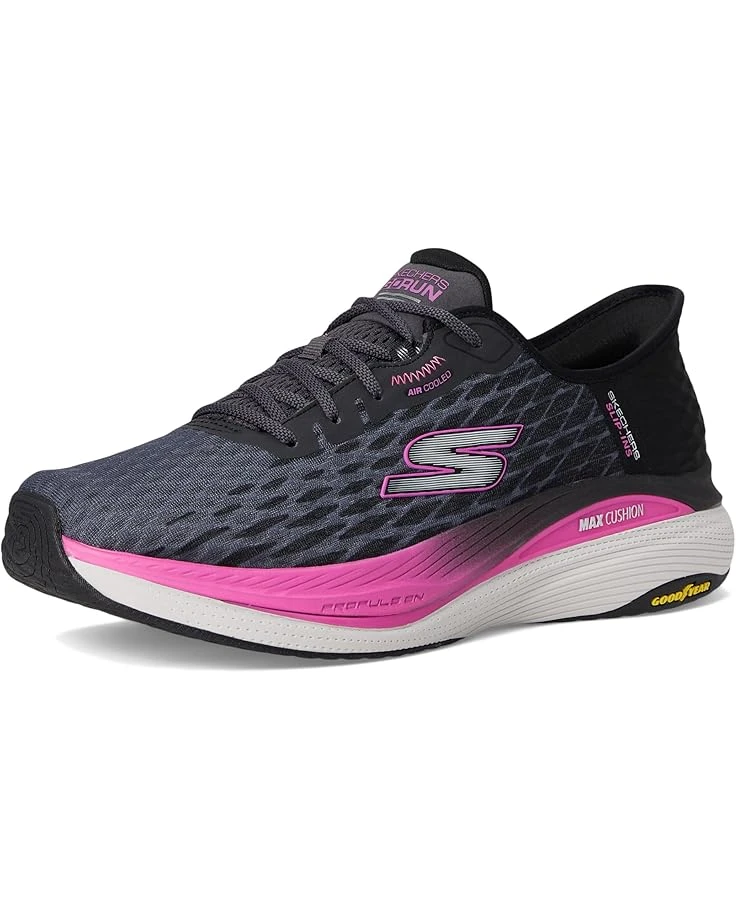 - Walk on clouds sporting SKECHERSยฎ Max Cushioning Propulsion Vitality Hands Free Slip-Ins. These athletic slip-ons are crafted for those on the go, featuring a breathable mono-mesh upper and a lace-up design for a secure fit. The Heel Pillowโข ensures easy, hands-free wear, while the Air-Cooled Memory Foamยฎ insole and Ultra Flightโข midsole provide cloud-like cushioning. Enjoy exceptional traction and durability with the Goodyearยฎ non-slip rubber outsole. Whether you’re hitting the gym or the streets, these sneakers deliver the perfect blend of comfort, support, and sleek style.