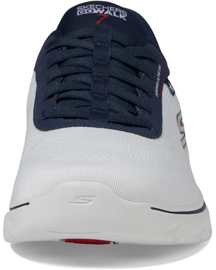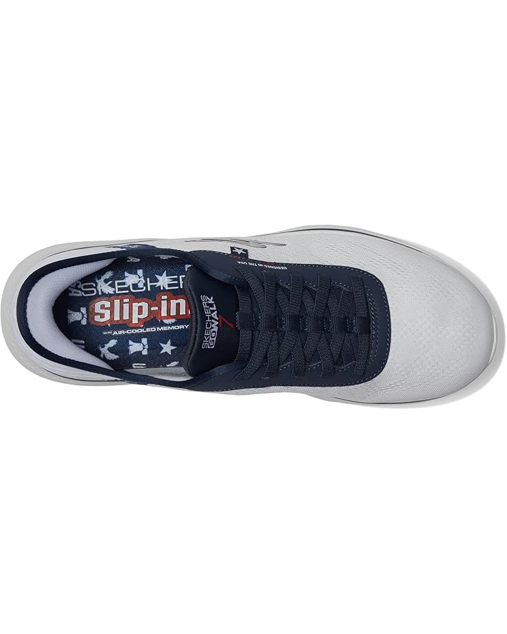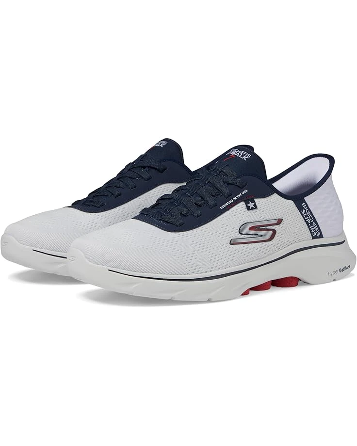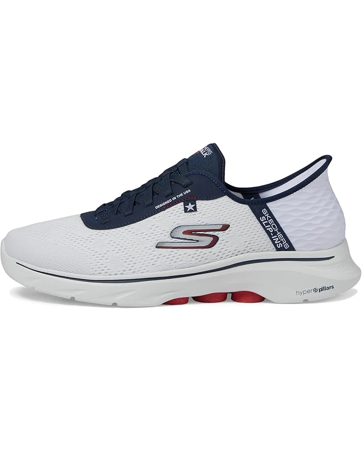 - Give cheers to the red, white and blue in Skechers Hands Free Slip-ins®: GO WALK 7™. Crafted for both style and comfort, this American themed walking design features our exclusive Heel Pillow™, an engineered mesh upper with stretch laces, Skechers Air-Cooled Memory Foam® insole, lightweight ULTRA GO® cushioning, and high-rebound Hyper Pillars™ for added support.