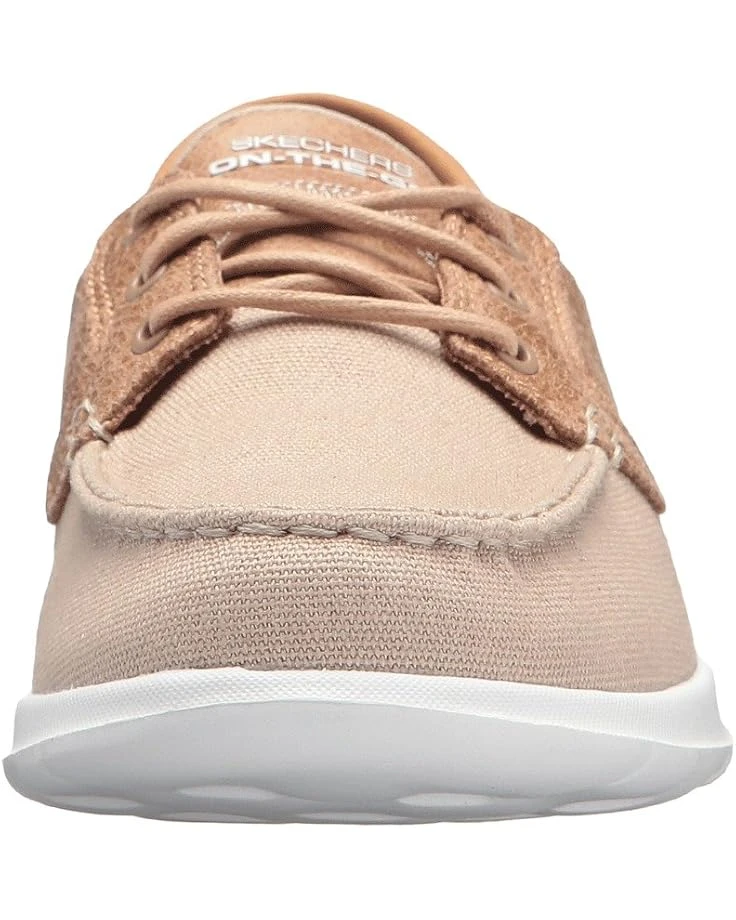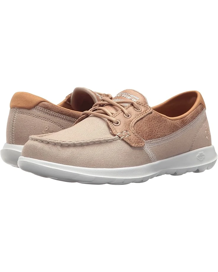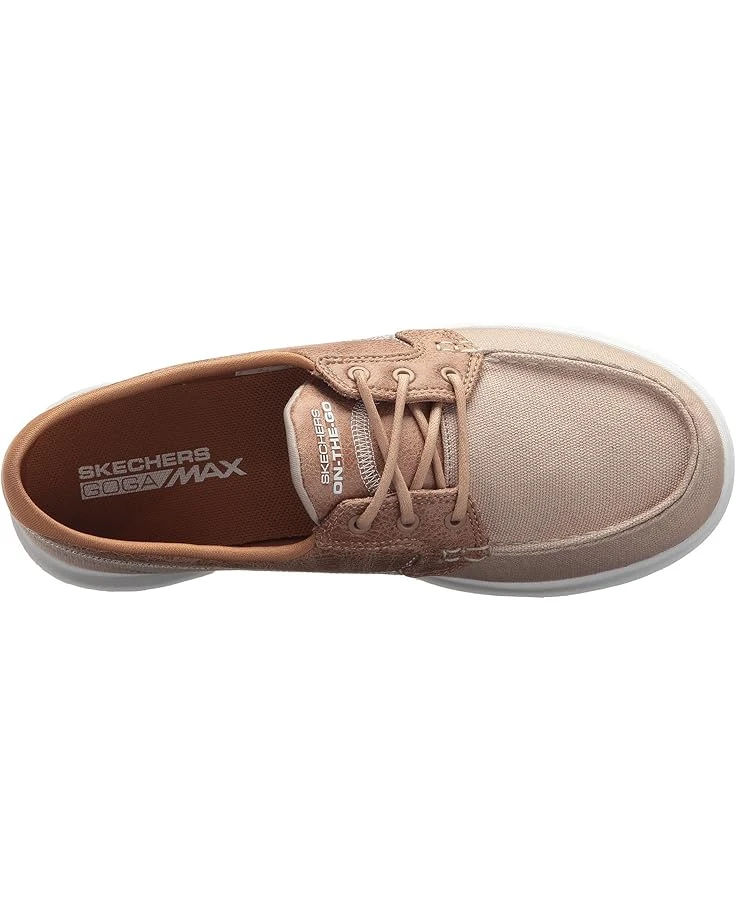 - The SKECHERSยฎ Performance GOwalk Lite – Coral boat shoe with a color-block finish, linen fabric upper, and machine washable design.