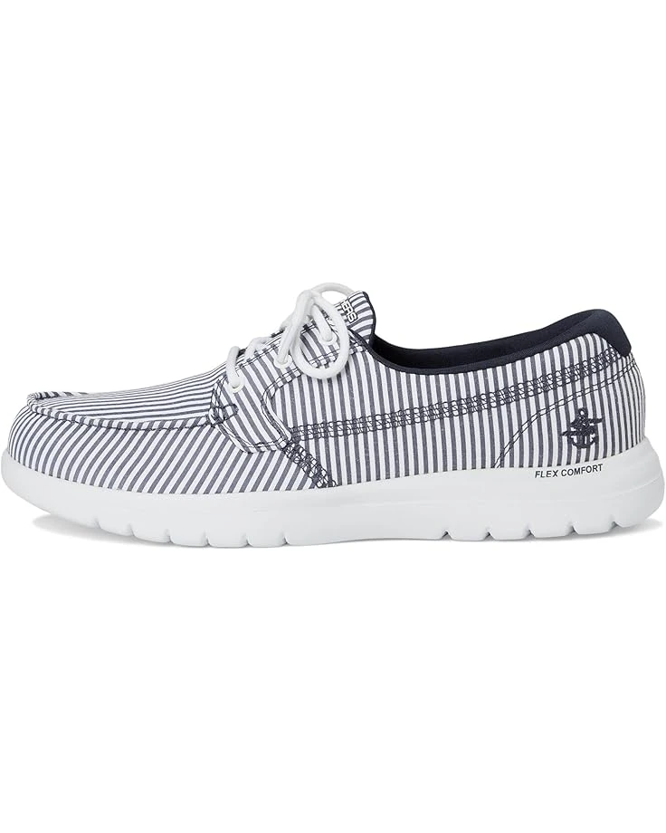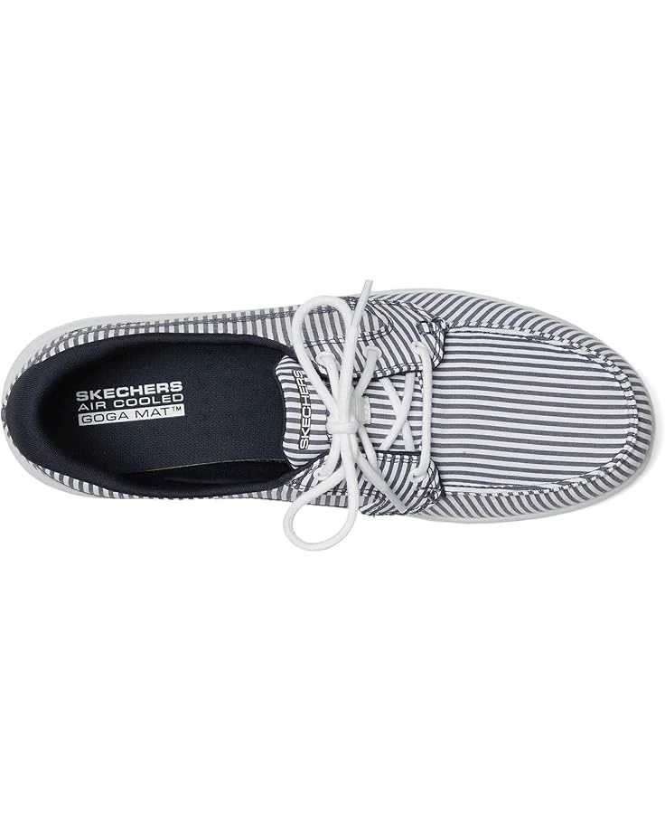 - Set sail in style wearing the SKECHERS® On-The-GO Flex – Lighthouse! This classic nautical-inspired boat shoe boasts a striped linen upper for timeless charm and a pull-on design for effortless wear. Enjoy the ultimate in all-day comfort with the breathable Skechers Air-Cooled Goga Mat™ insole and lightweight ULTRA GO® cushioning, perfectly paired with an EVA outsole for flexibility and durability.