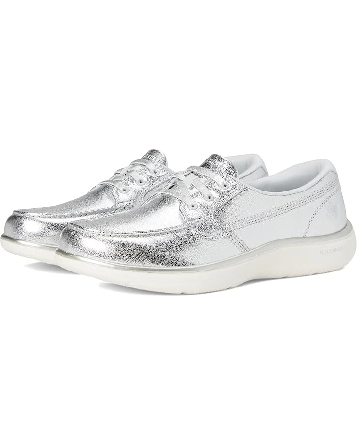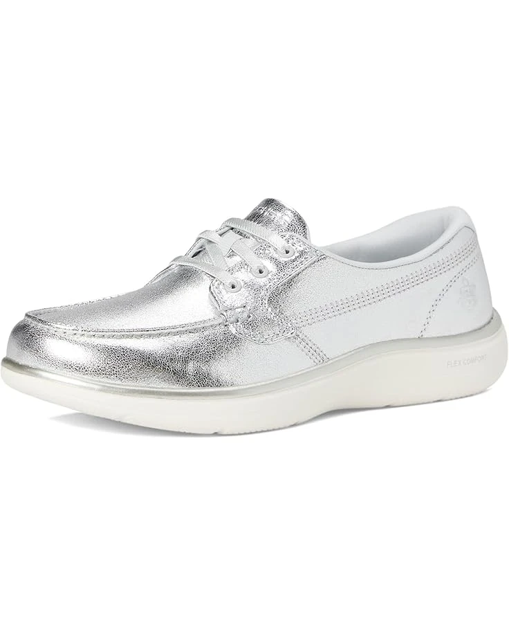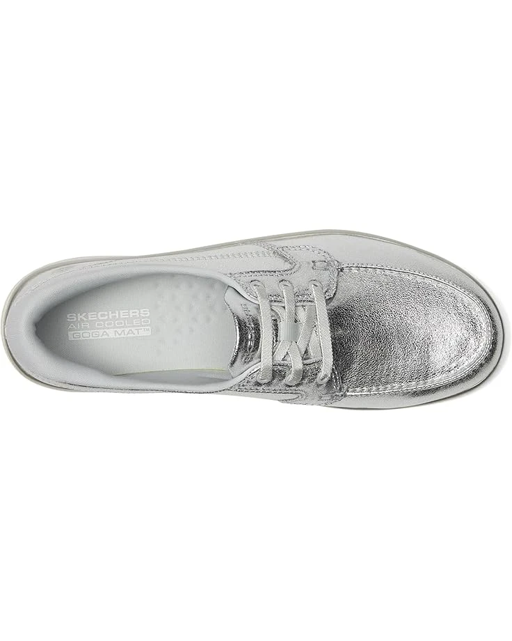 - Be the trendsetter wearing SKECHERS® Performance On-The-Go Flex Radiant Metallic Canvas Boat Shoe-where comfort meets trendsetting design. Crafted with a sleek metallic canvas upper and an unlined interior, this boat shoe radiates a fresh, nautical-inspired vibe. Featuring fixed laces for a secure fit and the innovative Air Cooled Goga Mat™ insole for all-day comfort, it takes your footwear game to the next level. The ULTRA GO® cushioning ensures lightweight support with every step, while the flexible EVA insole and outsole provide a smooth, responsive ride. Pull-on design makes it easy to slip in and out of these stylish shoes, making them perfect for any adventure.