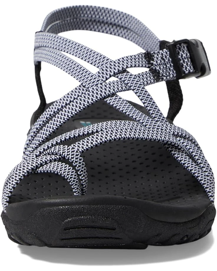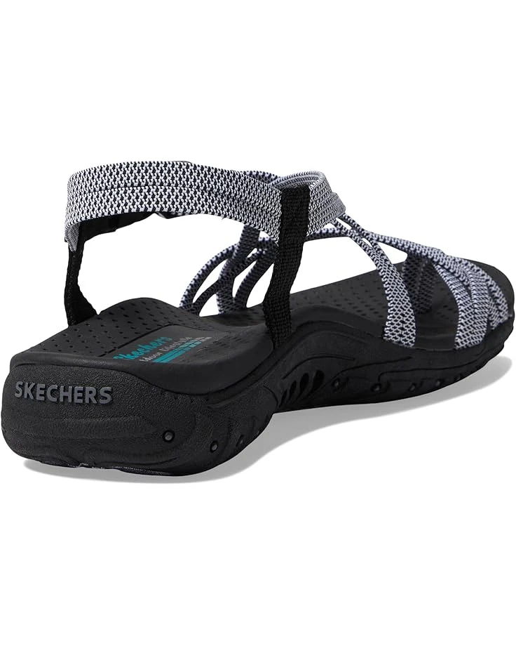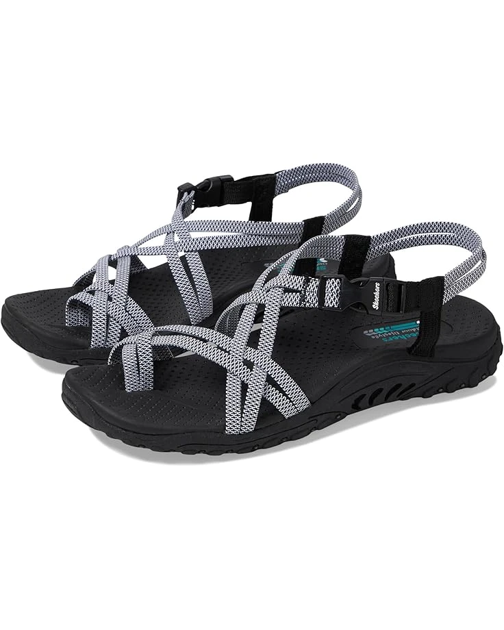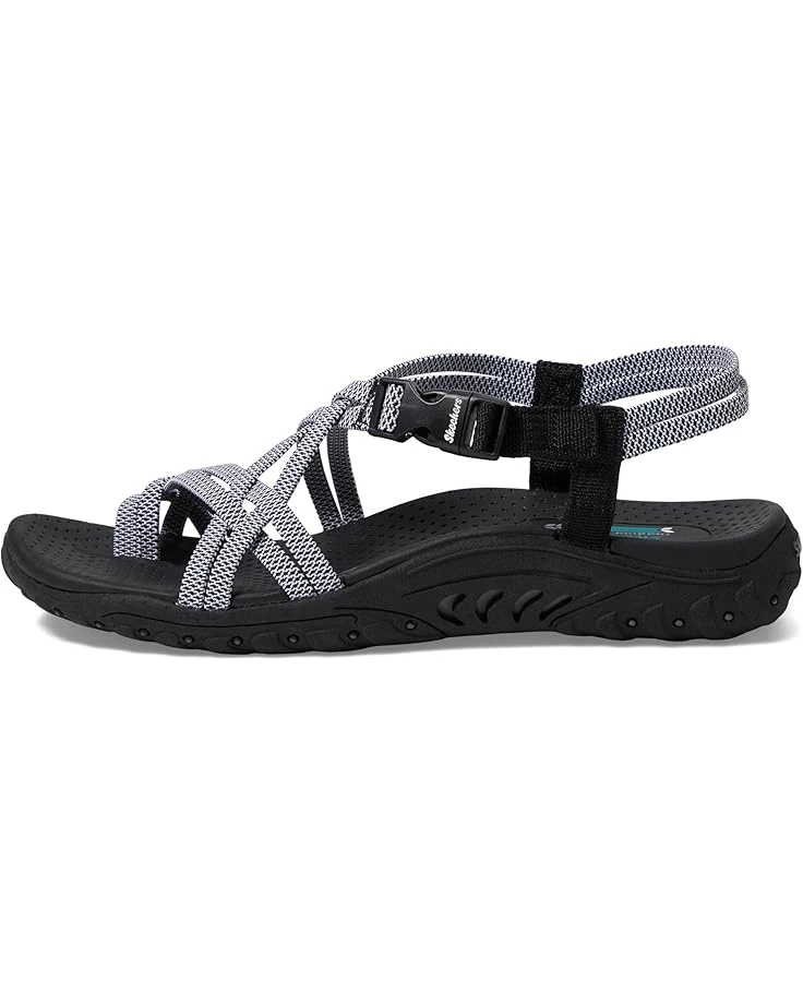 - The SKECHERSยฎ Reggae – Irie Mon sandal boasts comfort and eye-catching style with a river-style design, woven straps, and an open toe.