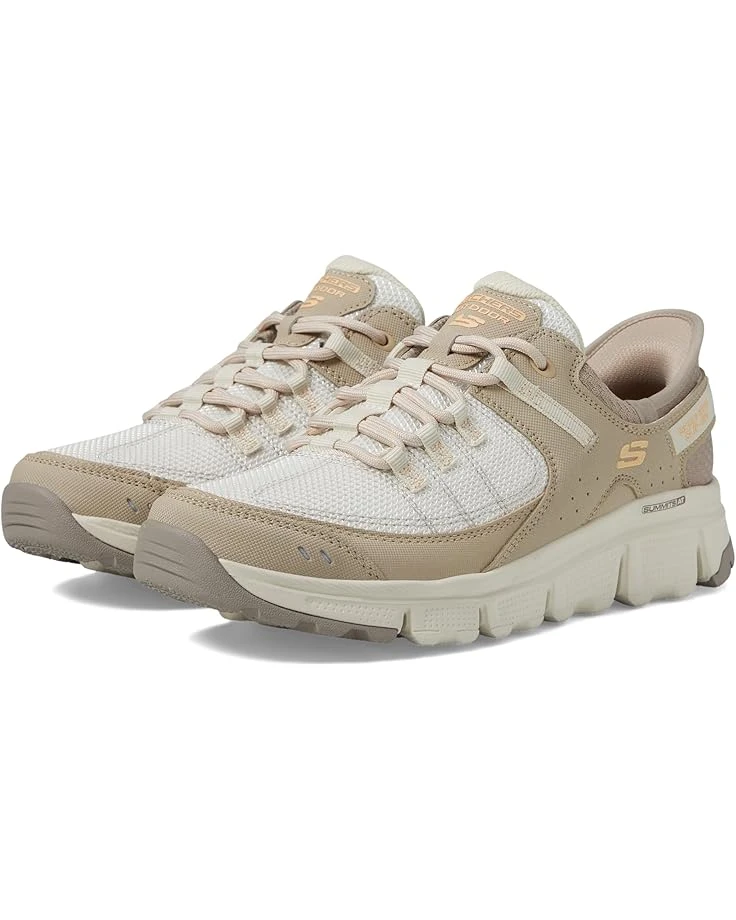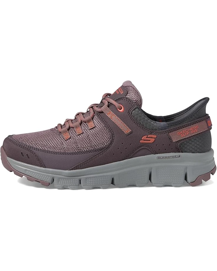 - Bring cushioning support to your every leap wearing the Skechers® Summits At Hands Free Slip-Ins Sneakers. The pull-on footwear features synthetic dura leather and mesh upper with cushioned Skechers Air-Cooled Memory Foam® insole, bungee lace closure, padded collar and tongue for all-day comfort.